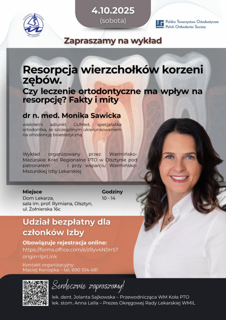 w imieniu Pani lek. dent. Jolanty Sajkowskiej – Przewodniczącej Warmińsko-Mazurskiego Koła Regionalnego Polskiego Towarzystwa Ortodontycznego Oddział w Olsztynie, mamy przyjemność zaprosić Państwa do udziału w wykładzie pt. „Resorpcja wierzchołków korzeni zębów. Czy leczenie ortodontyczne ma wpływ resorpcję? Fakty i mity.”, który przeprowadzi dr n. med. Monika Sawicka – pracownik naukowo-dydaktyczny w Zakładzie Ortodoncji Gdańskiego Uniwersytetu Medycznego.